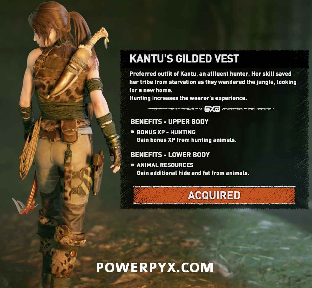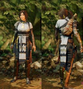 Description: Preferred outfit of Kantu, an affluent hunter. Her skill saved her tribe from starvation as they wandered the jungle, looking for a new home. Hunting increases the wearer’s experience.