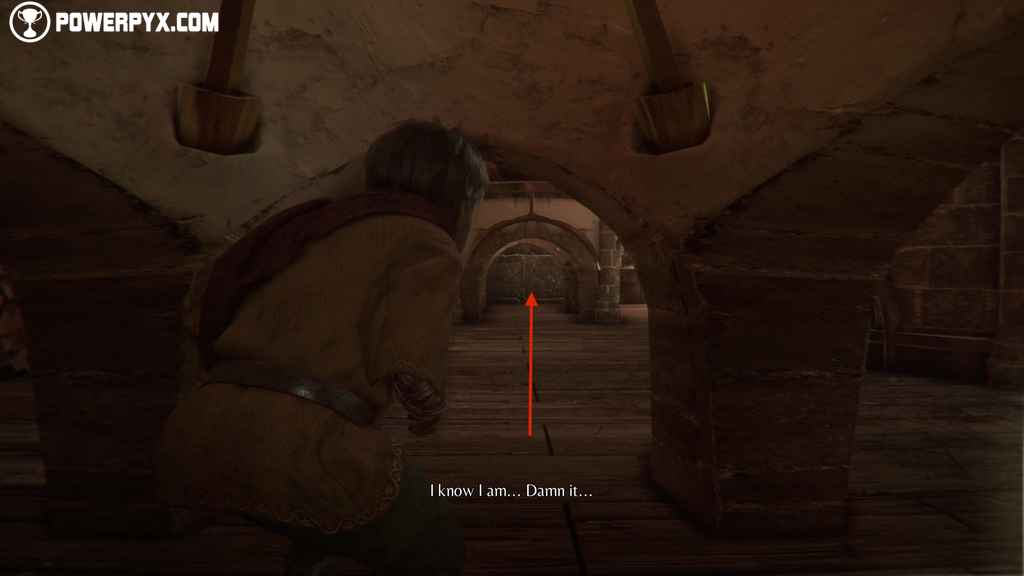 Crawl through the crack in the wall next to Beatrice’s cell and wait for the guards to spread before moving on.