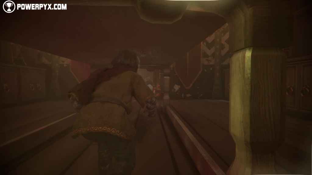 Upstairs, wait for the monk to grab the distillate barrels before moving and the continue on through the bottles. Then, turn right to find another monk working with some crates and quietly access the bridge bringing to the distillate mixing area.