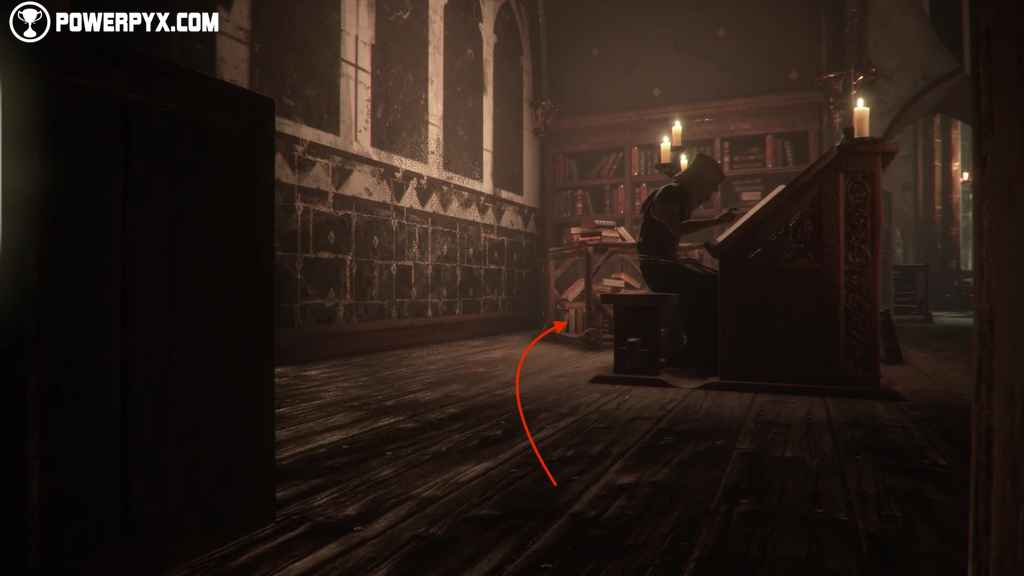 Hide under the book cart when the monk doesn’t look, then wait for him to walk to the other side of the room before crouching on under the cabinet.