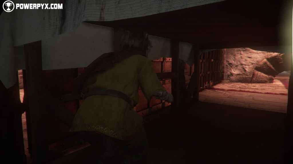 or you’ll be spotted). After turning left (use the pictures below if you need help), enter the new area, walk across the room, and hide under the table to make the trophy pop.