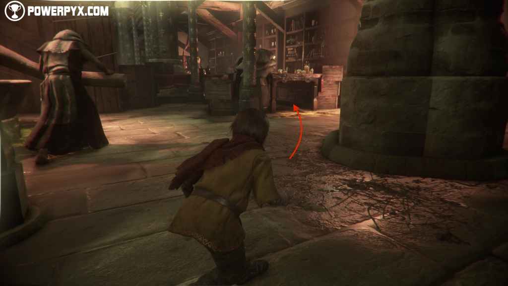 Once you’ve reached the other side of the room, hide under the book cart for just a split second to make sure no monks are patrolling and then turn back around. Here, try to avoid hitting the glass bottles on the floor and then keep going through a new hidden corridor.