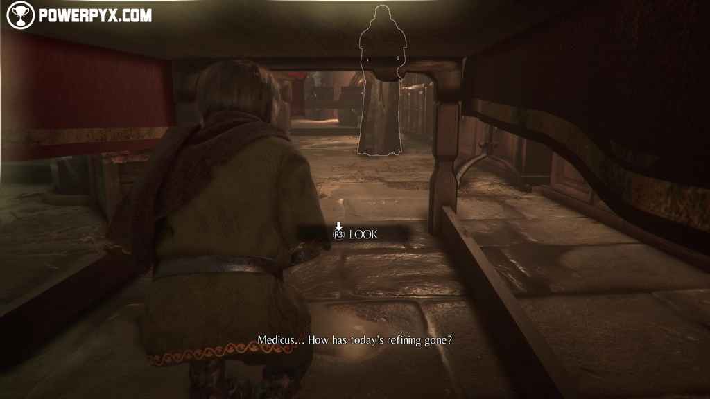 Then, wait for the guards to finish talking and then continue on to reach the third pool of distillate. Here, right after the small set of stairs, head left to avoid coming across the guard and the monk.