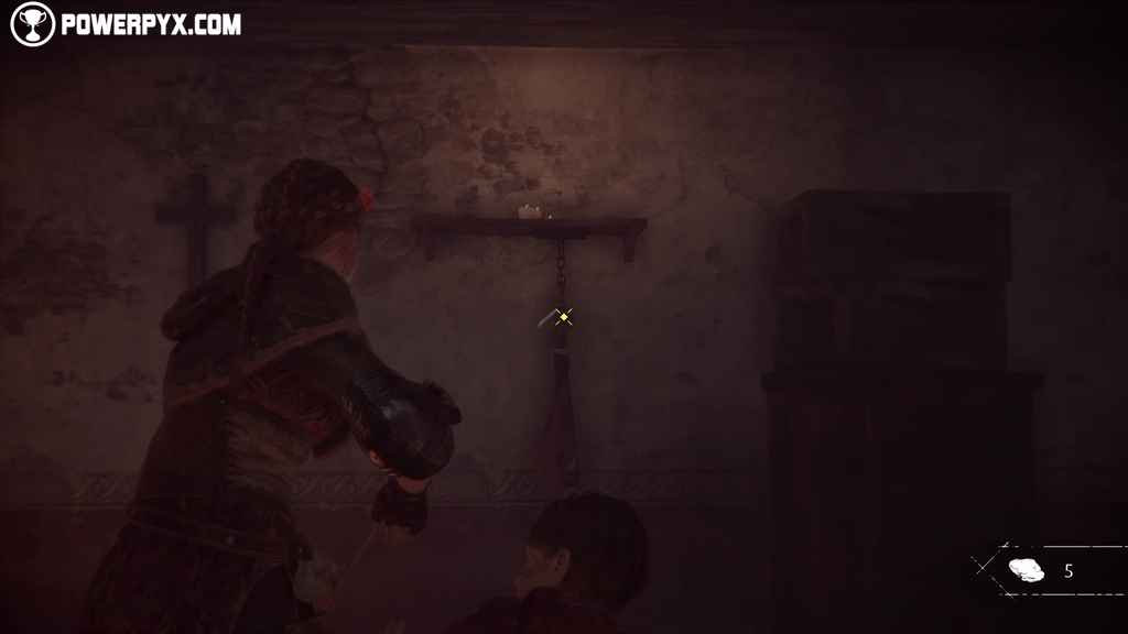 Amicia and Hugo managed to take refuge inside the village’s church and are now closer to Laurentius. Let’s start by picking up a collectible (Gift 3 – Rosary) that you can find on the right of the altar at the end of the right aisle. Then retrace your steps to climb a ladder.