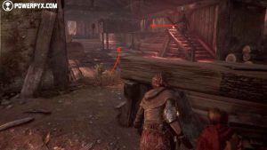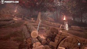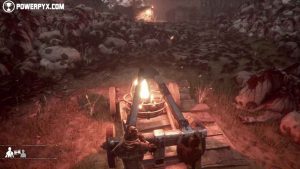 Take another stick and keep going until you come across a cart with a brazier on it. Light the brazier and start pushing the cart uphill until you get to the farm’s gate.
