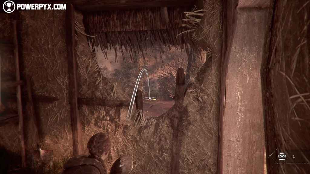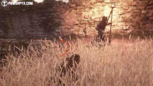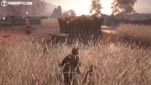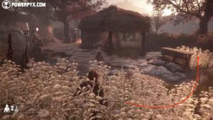 Now we’re ready to continue. Go back to the main trail and continue on until you see some grass. From here a kind of a lengthy stealth section starts. Remain hidden in the grass a throw a rock to the armour pieces inside the chest to attract the guard nearby. When the guard walks back to his station, you’re free to go.
