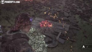Continue on until you find some sticks. Grab one and use the torch shown in the picture to light it and create a path to the firewood to light this one, too.