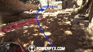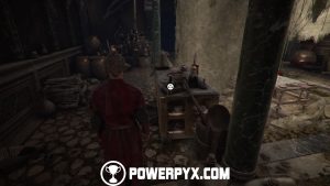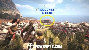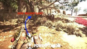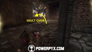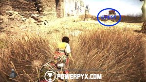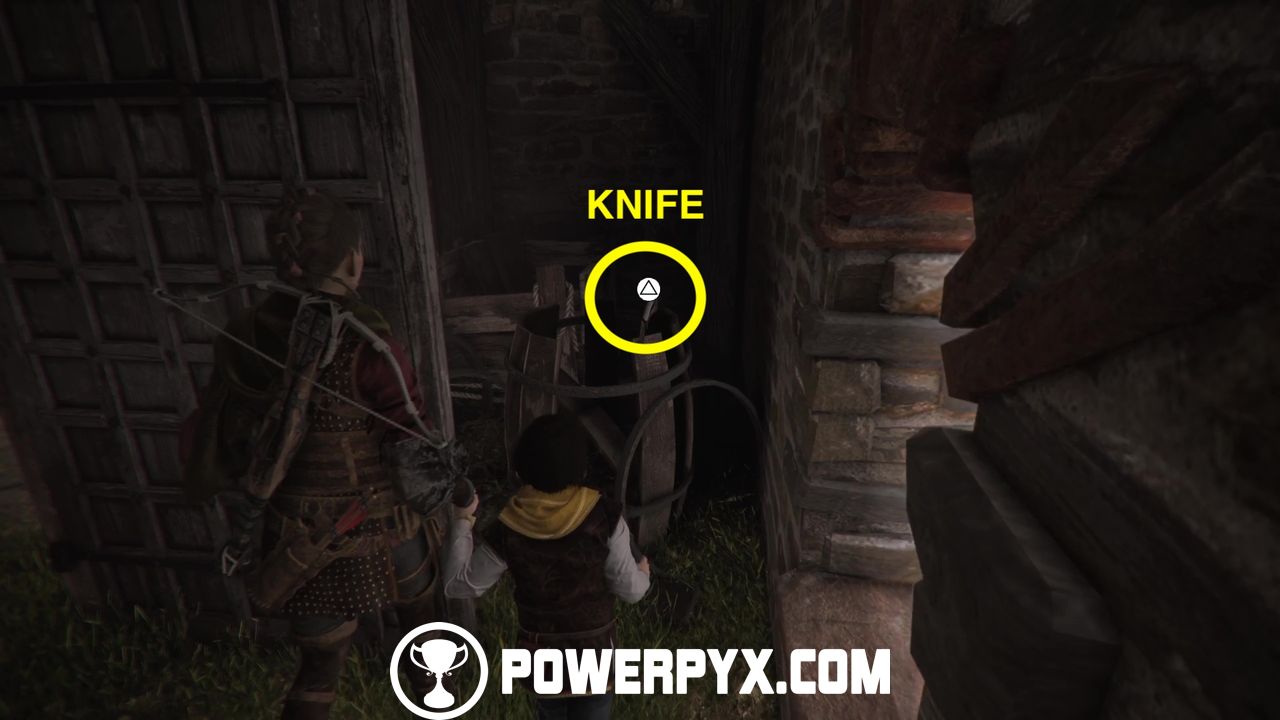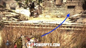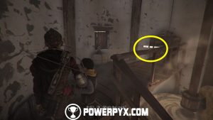 Now go back down and around the building to the front door to access it and find a tool chest with upgrade materials. Exit the building and go past the dead tree with all the people, then continue along the same path past a watchtower. Grab the tool chest inside the watchtower (access from the left ledge when facing it), then cross the bridge and you should see a ruined tower in front of you. Facing the tower from the bridge, access its right side and shoot the door lock from the window, then access the tower and enter the room you’ve just unlocked and grab the knife from a broken barrel. (Note: if you already have a knife in your inventory, make sure to grab it AFTER getting Secret Chest #6, see the paragraph below. Then you have a Knife for Secret Chest #7).