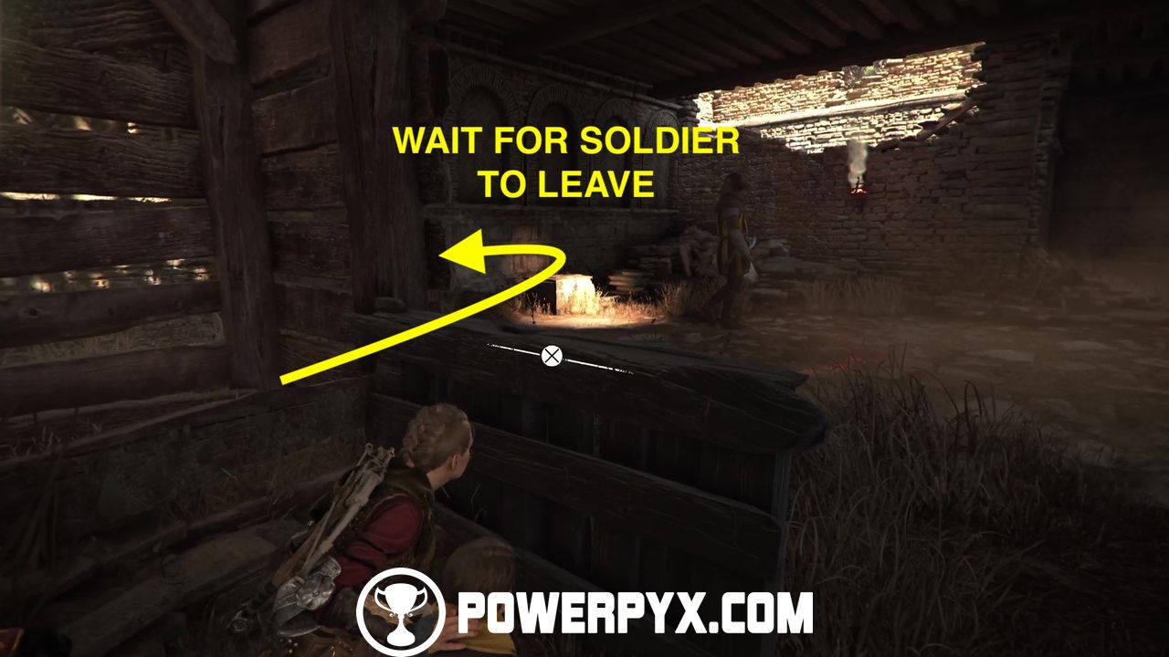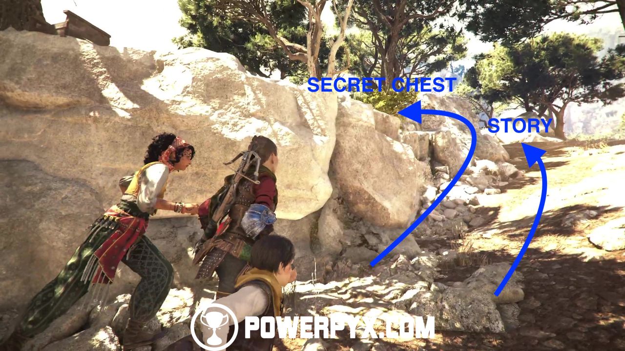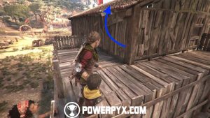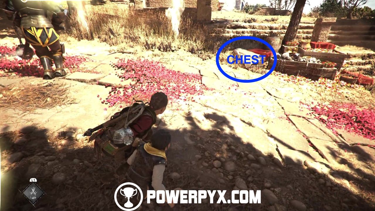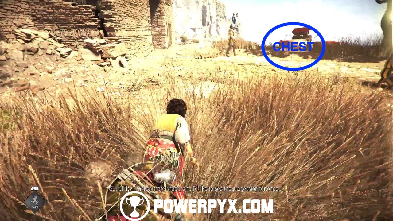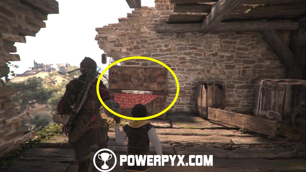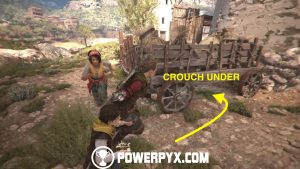When no one’s looking, try to open the chest for some upgrade materials. Then, return to the same patch of grass and go up the hill and behind the cart.