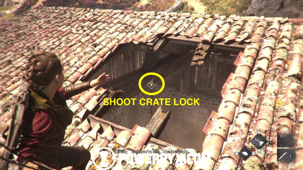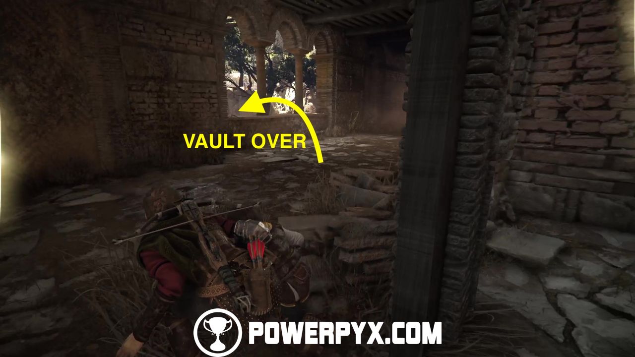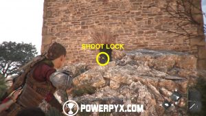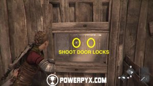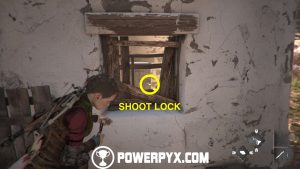 Now climb back down onto the balcony and look through the small window. From here, shoot two rocks at the chain locks in the distance to unlock the building.