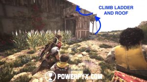 Go back down the stairs that gave you access to the windmills and head for the building the kites are attached to. Climb up the ladder at the back and access the roof.