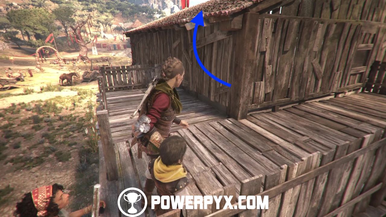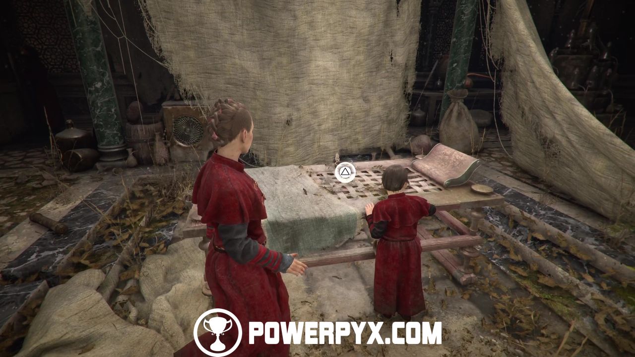 Now drop down from the wooden ledge and continue on to trigger a new cutscene during which Hugo, Amicia, and Sophia will dress up to attend the ceremony.