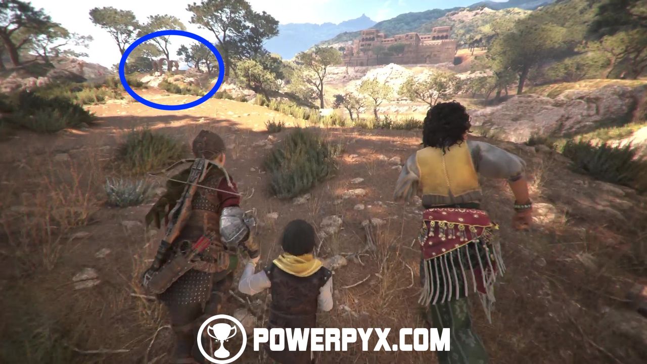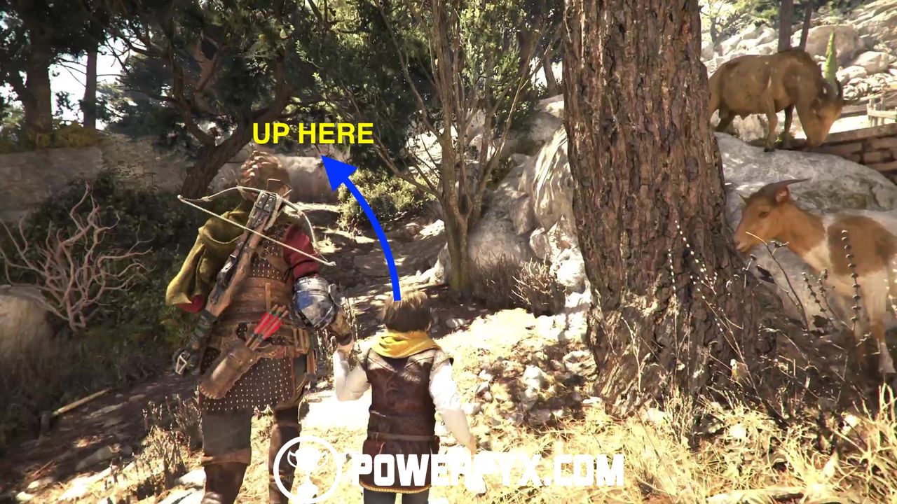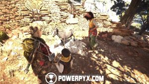 Continue up the trail until you see a fountain. Approach it to drink some water and then continue on until you’re blocked by a goat herd.