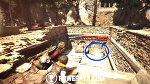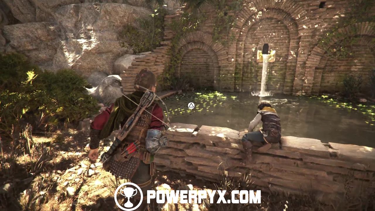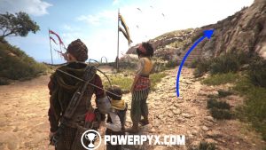 Exit the amphitheater and cross the bridge again, going in the general direction of the mountain. Keep going uphill and you’ll eventually reach a gate. Interact with it to open it.