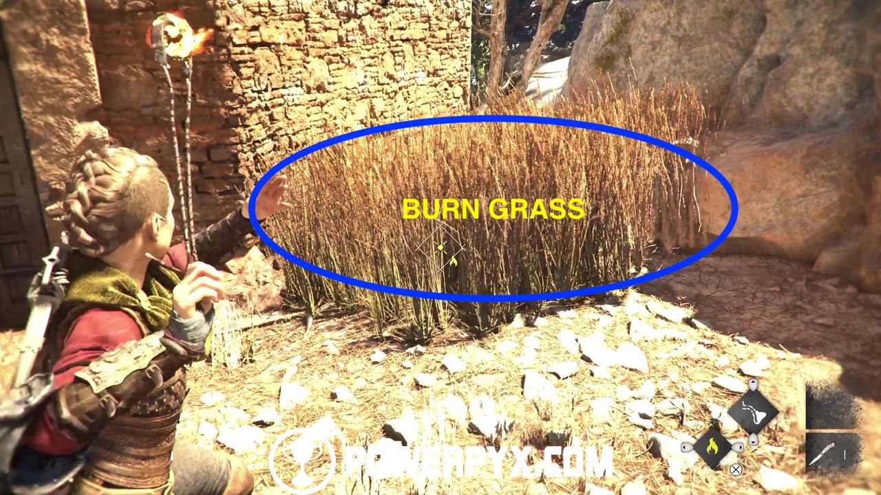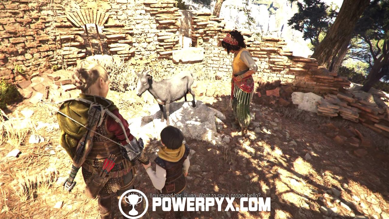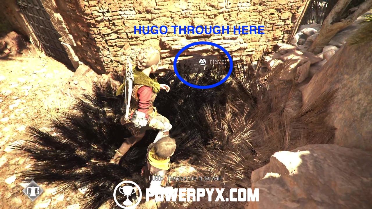 Go up the side path and climb the ledge. Keep going until you spot a ruined building on your left and you should hear some bleating. This is Tramontane, the missing goat, but she’s stuck inside. Burn the bush next to the door and instruct Hugo to crawl inside.