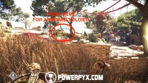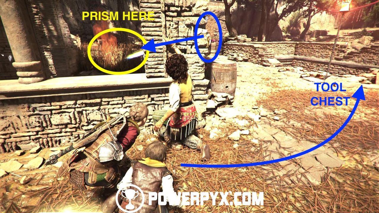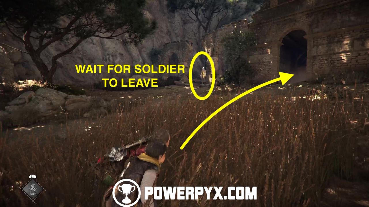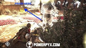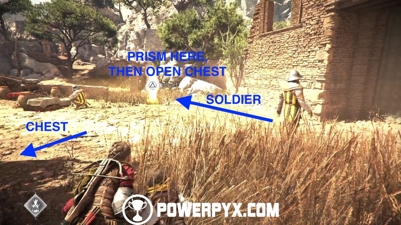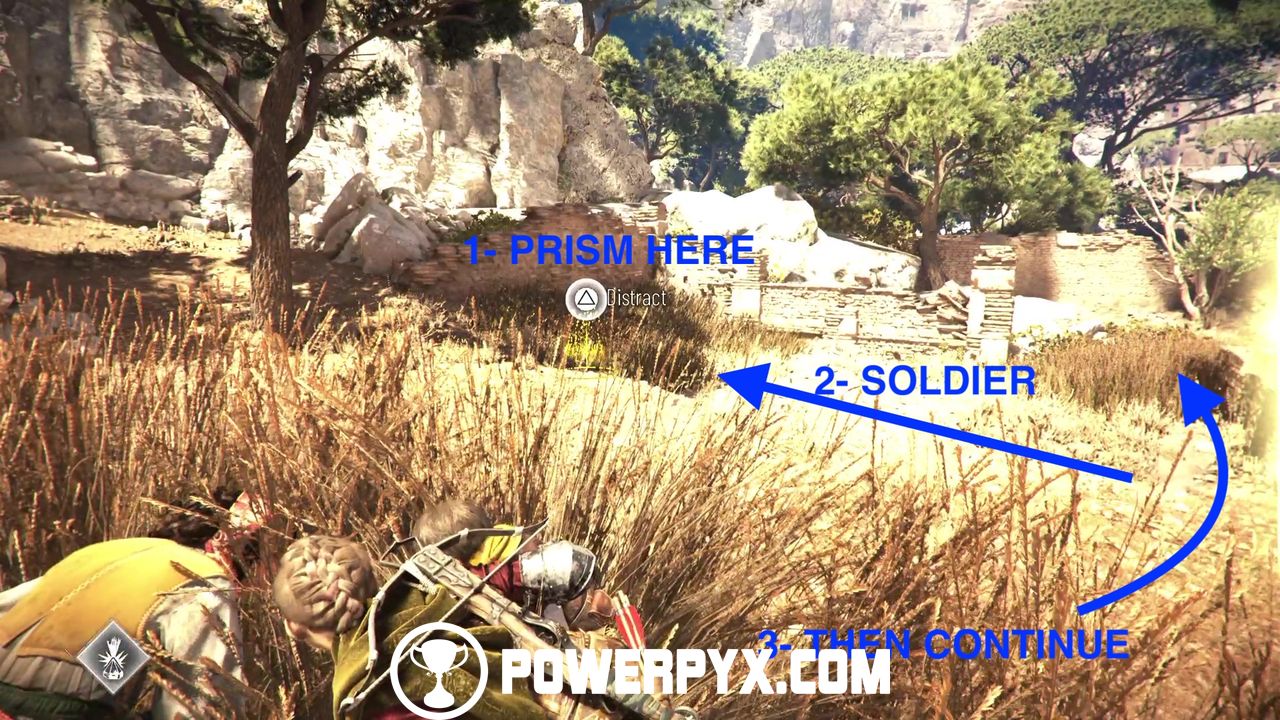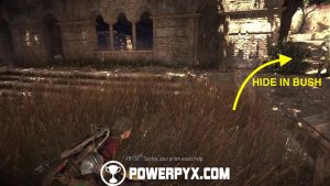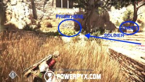 Return now to the main side path and you’ll eventually reach a patrolled area. In this area you cannot kill or be spotted by anyone. However, you can use Sophia’s prism to distract enemies to specific patches of tall grass.