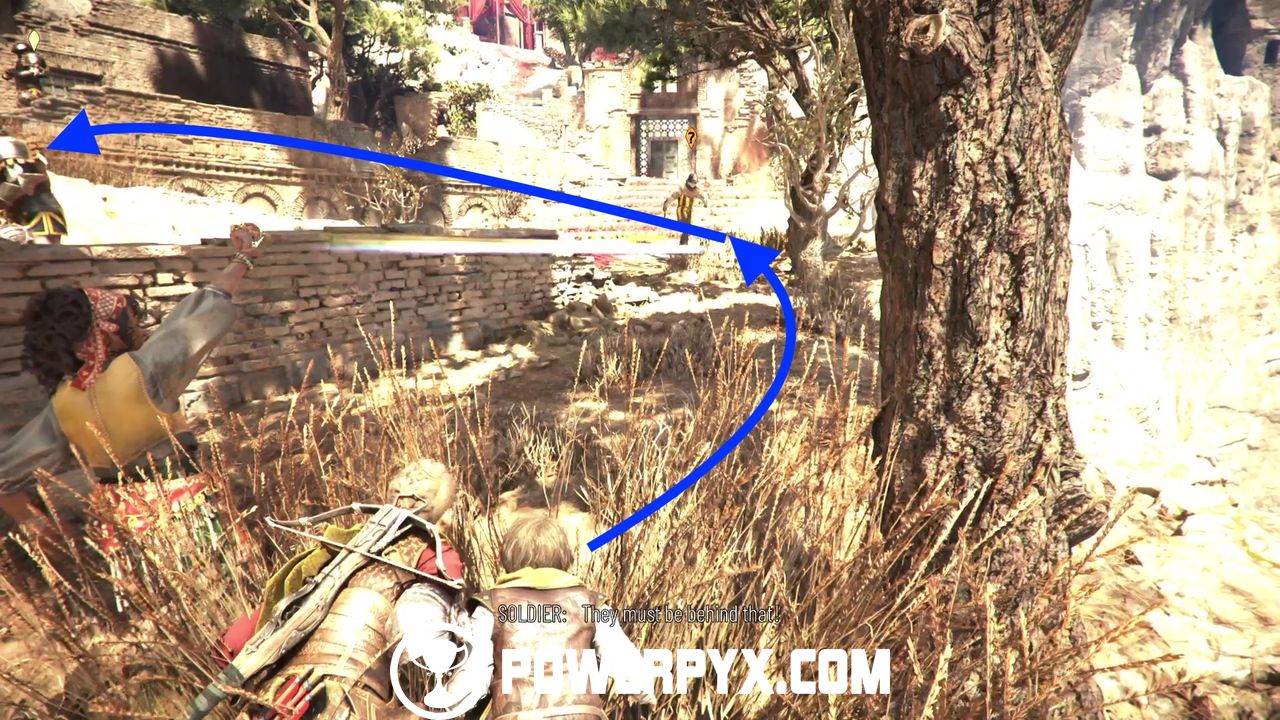 Now drop down and you should now be inside the room where the very first guard we met is in. While inside this room, climb over the wall to land in some grass near the tree with the red ribbon and from here go hide in the bush behind the big armored soldier.