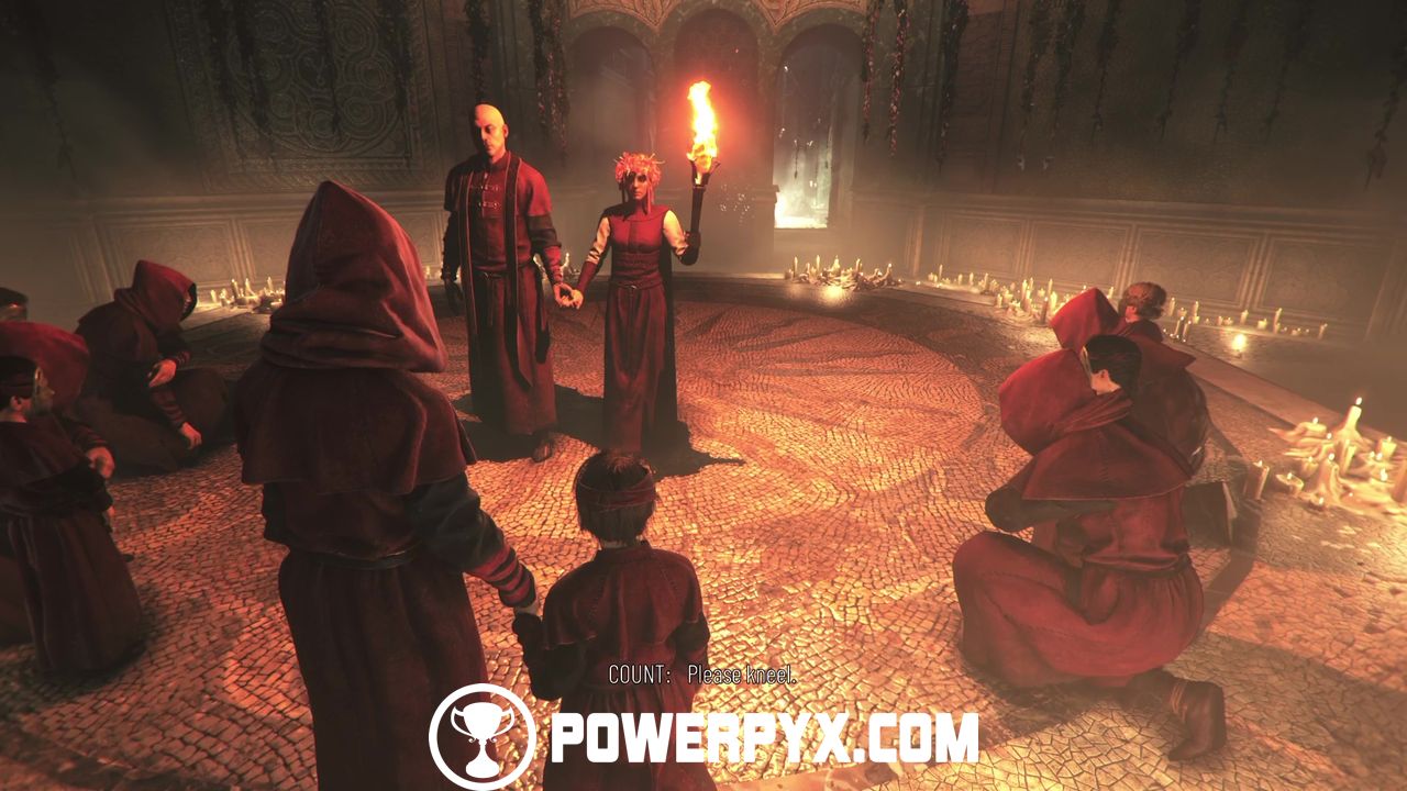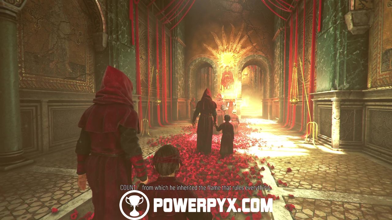 During the ceremony, the Count and the Countess recount the tale of the Child of Embers. Keep following the attendants and kneel when prompted to.
