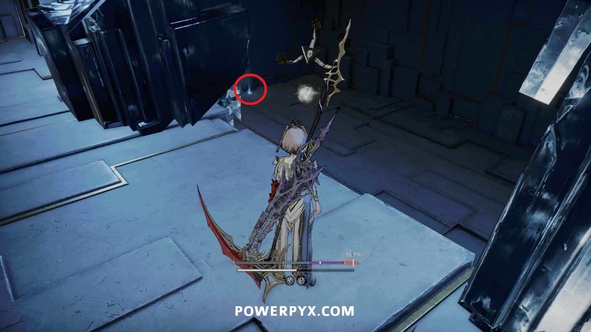 Take the shortcut elevator between Faultage Corridor and Evolving Palace areas and jump off onto the platform that is halfway through the elevator. Follow the path sticking to the left to where you can pass a large mural on the right, and there is a square hole you can drop down to the left to reach a lower area. Take the path leading to the left, going down the first set of stairs then left again down the stairs into a dead end instead of the path over the Mud Drawing Room. This is on a body in the corner near a human enemy.