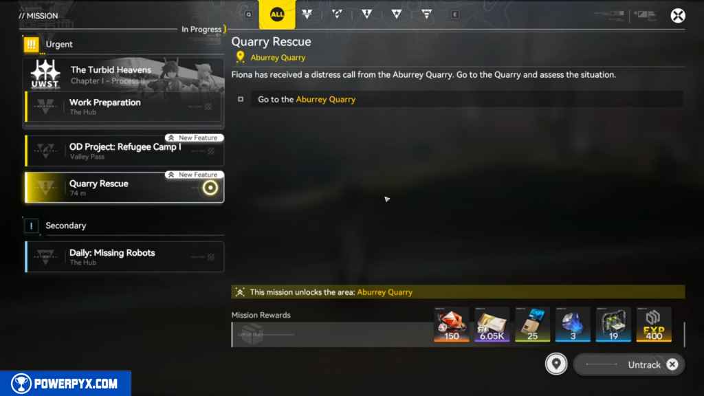 - Quest Description: Fiona has received a distress call from the Aburrey Quarry. Go to the Quarry and assess the situation