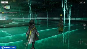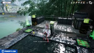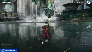 Once at the top, you find a floating green orb in the middle of a shallow water fixture. Head toward it.