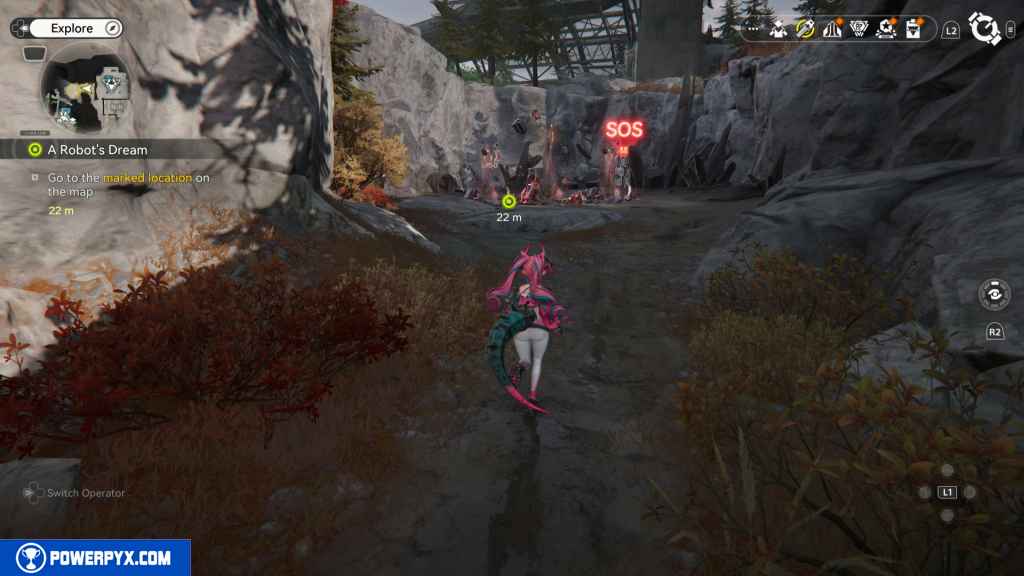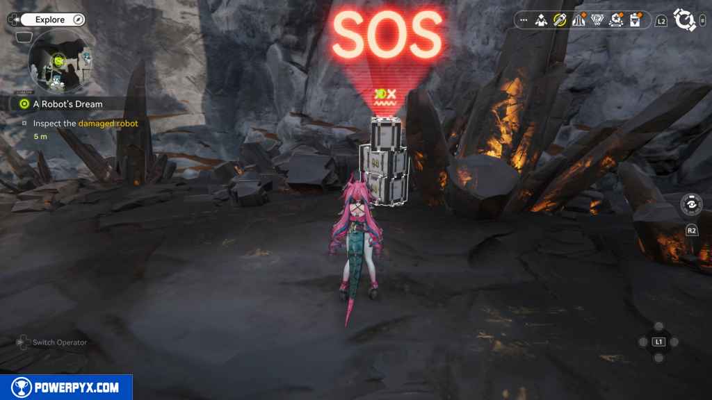 Next, continue east and around the corner, which sends you back west. You should see two SOS Repair Bots. Head to the first one on your right and trigger a cutscene.