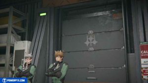 Approach two workers next to a rolling gate to continue.