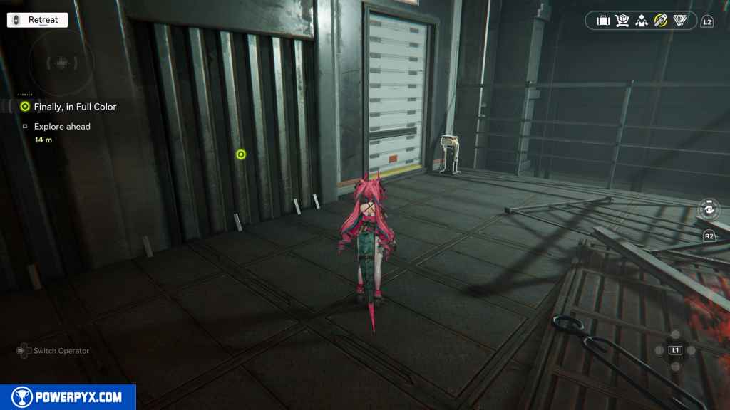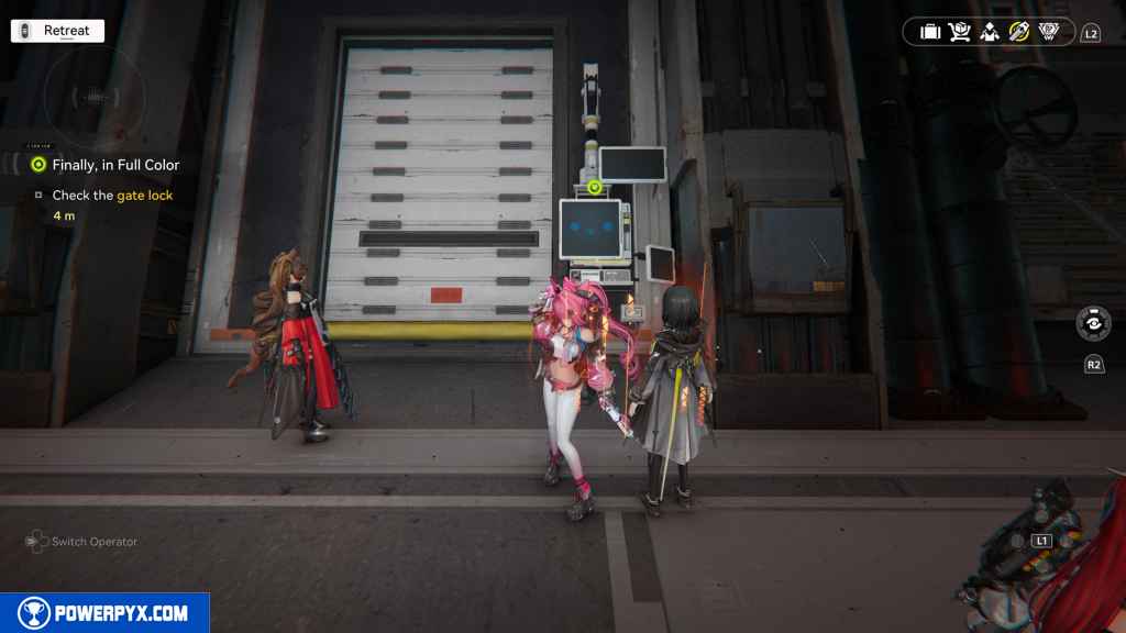 Interact with the smiling computer next to the rolling gate.