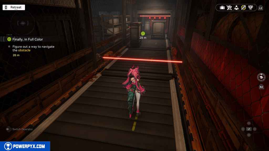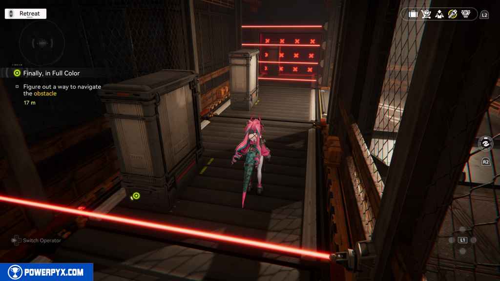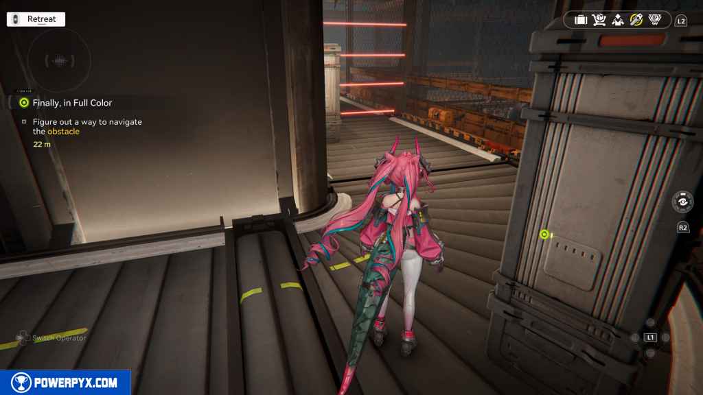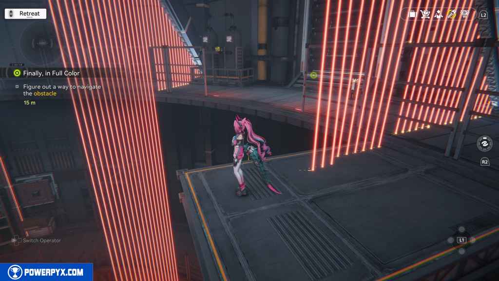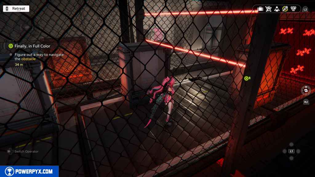Here, you deal with two rounds of lasers. For the first one, just stay to the outside again.