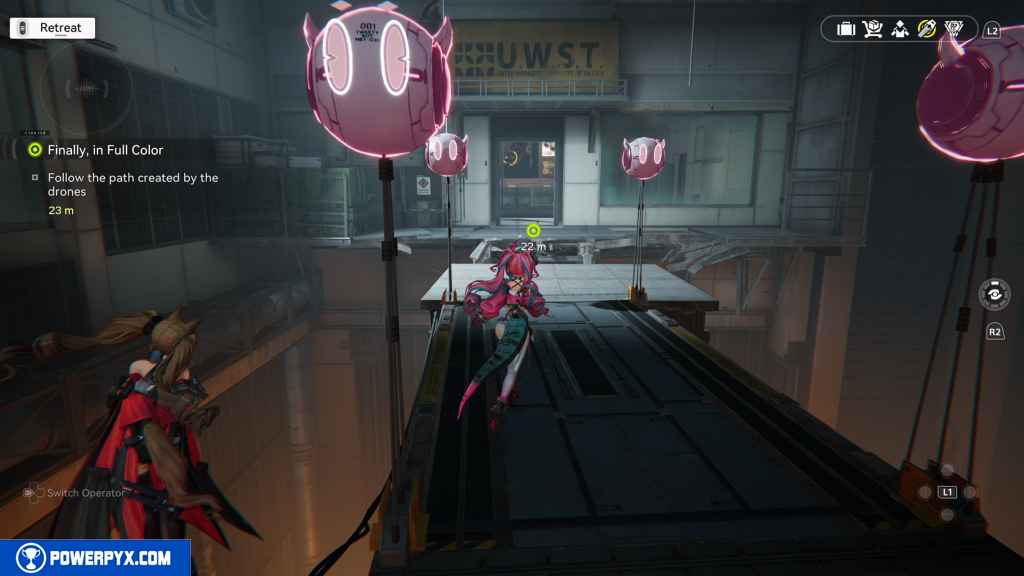 - Follow the path created by the drones