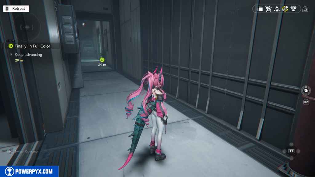 Get off the elevator and head right to continue.