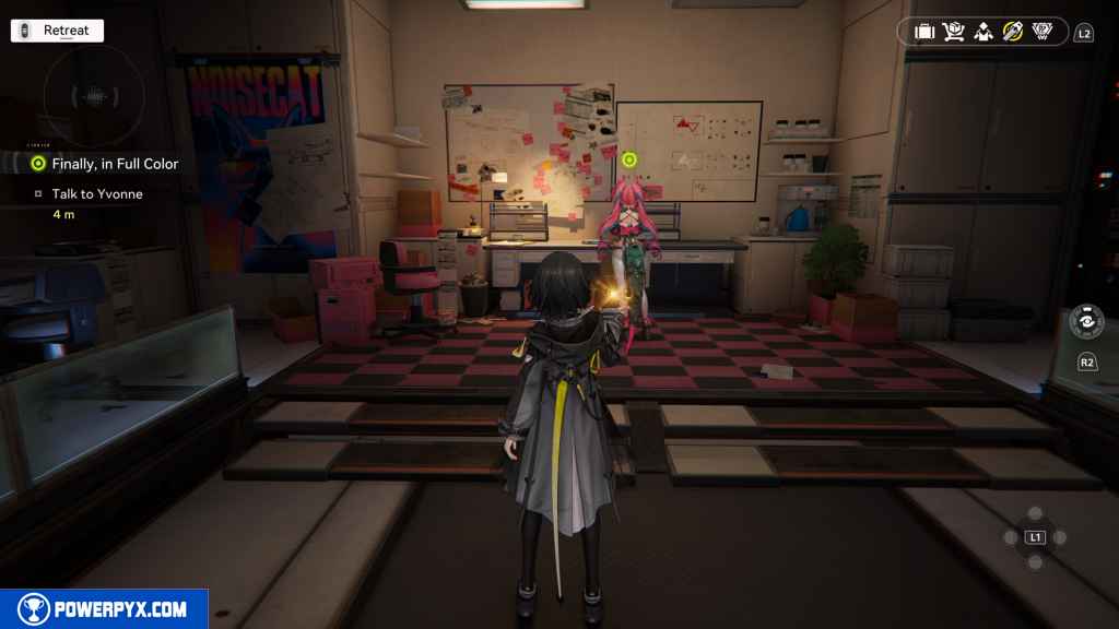 Head back out the way you came. Interact with Yvonne.