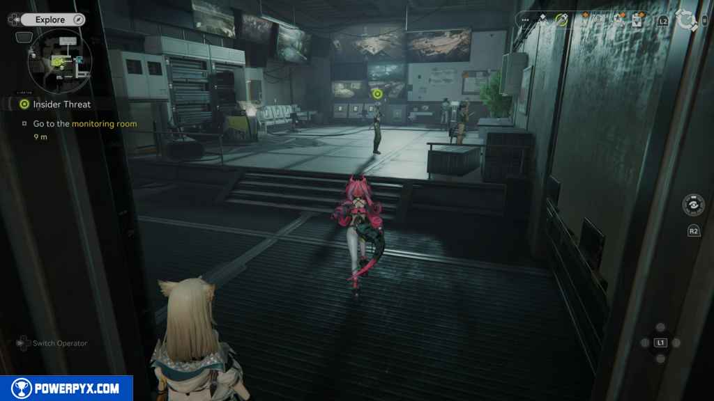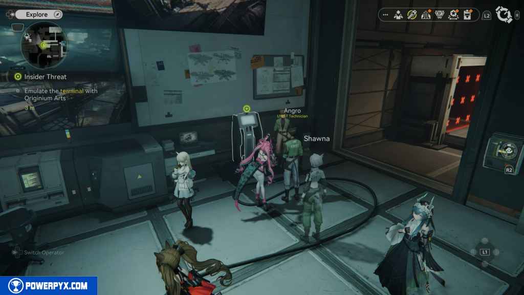 Head up the stairs to the monitoring room with Shawna. Approach Ango to speak to him.