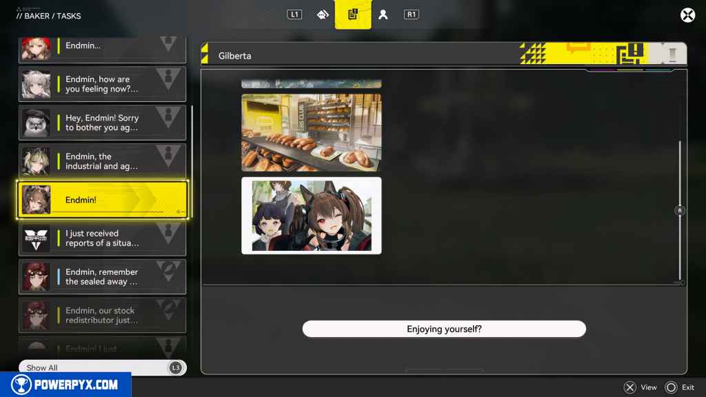 Select the chat where she shows you the inside of a bakery. Go through her dialogue and then back out of the menu.