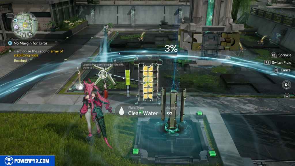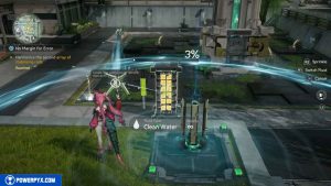 Activate the Water Flow device, and this will complete the Optional portion of the quest. You need to shoot the beam of water at the yellow glowing cubes. They will turn green, and a bar will fill up on the left side of the Array. You must keep the bar within the moving meter’s threshold to fill the percentage at the top of the array.