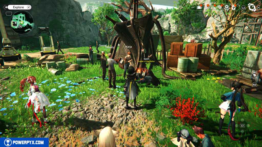 You’ll automatically return to the Refugee Camp. Walk up to the group of people talking in front of you.