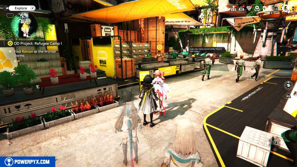Head back to the Hub Base and south to the Worker Dorms. Find Roman at the vendor stall to your left.