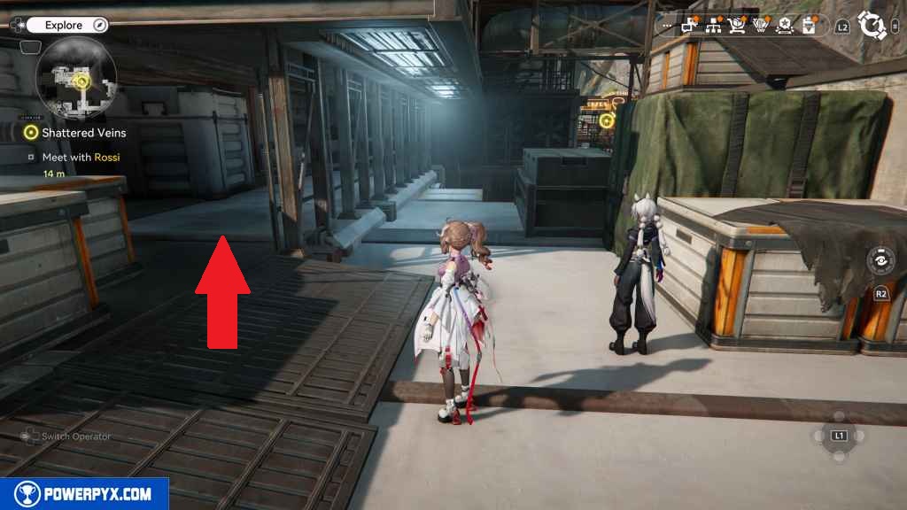 Keep heading north along the northern path. When you reach some boxes, go left and around them to the right.