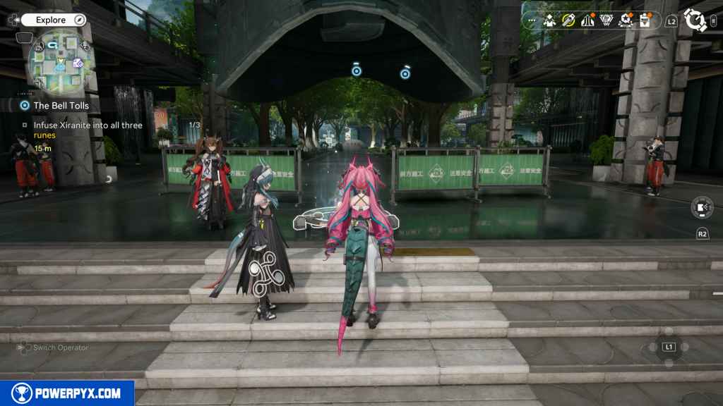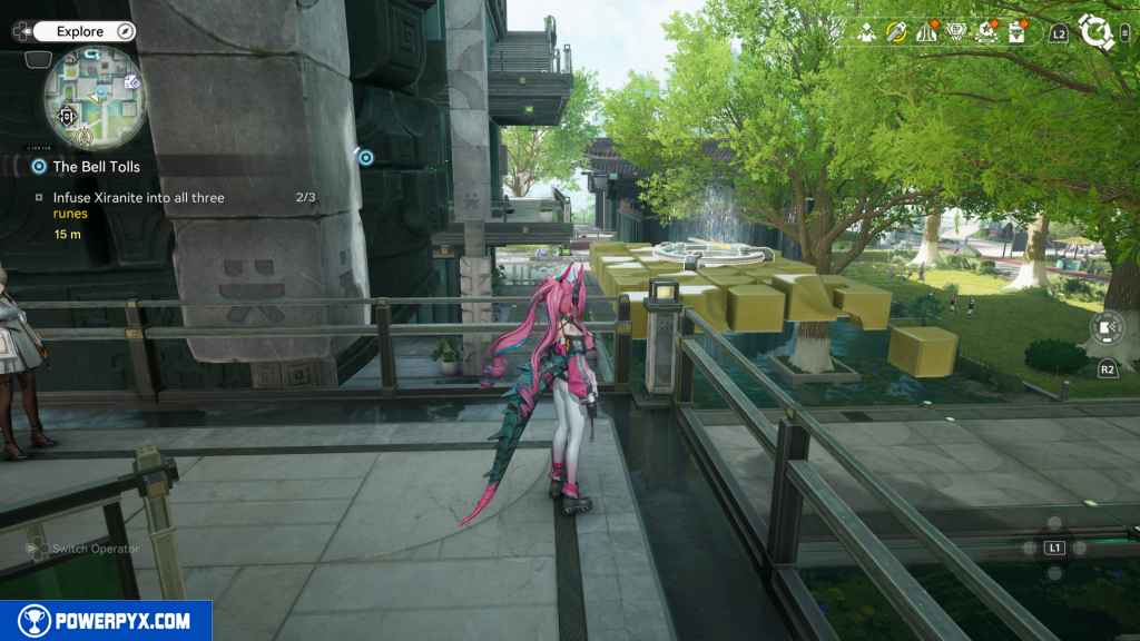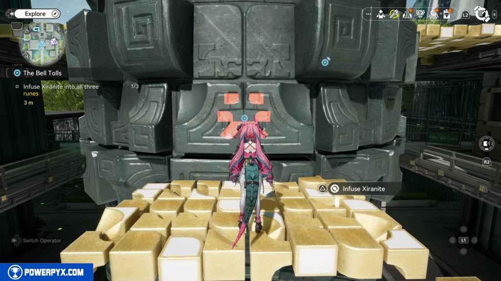You’ll need to head to the second floor on the east side of the large bell in the middle. When you reach it, jump the rail onto the platform and infuse the Xiranite into the bell part.