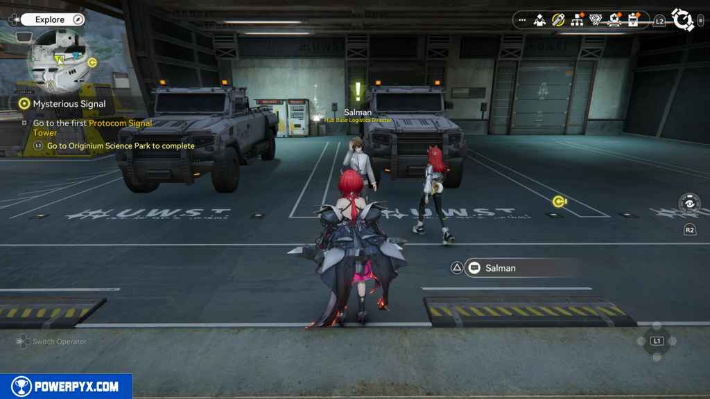 Head north of the TP location in the Hub Base to find Salman standing in front of two vehicles.