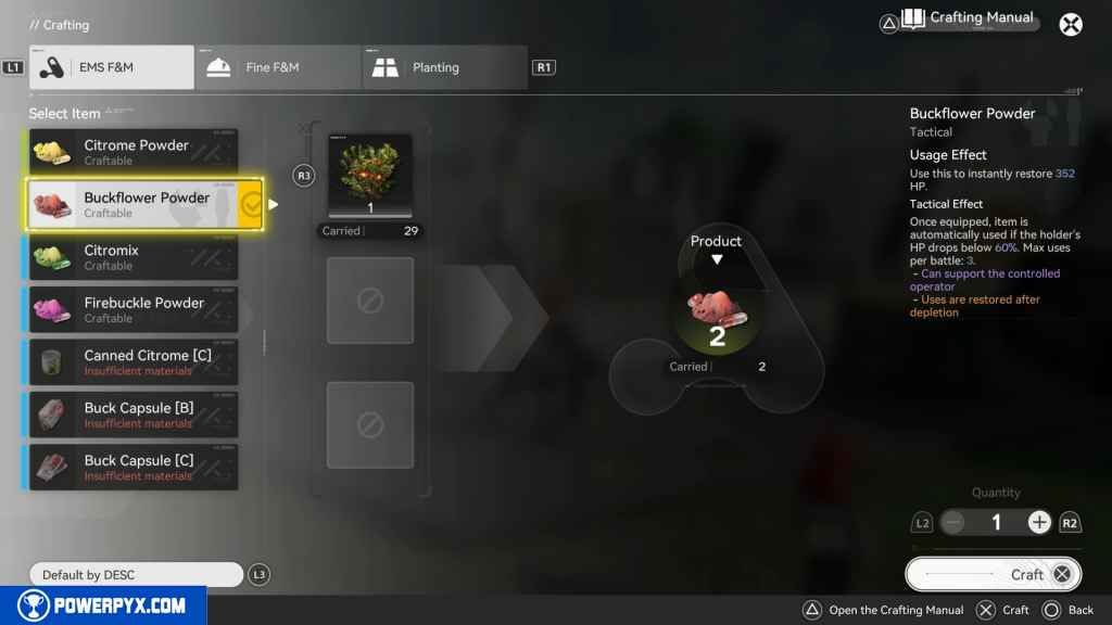 With some Buckflower in your possession, open the crafting menu and craft a Buckflower Powder.