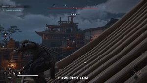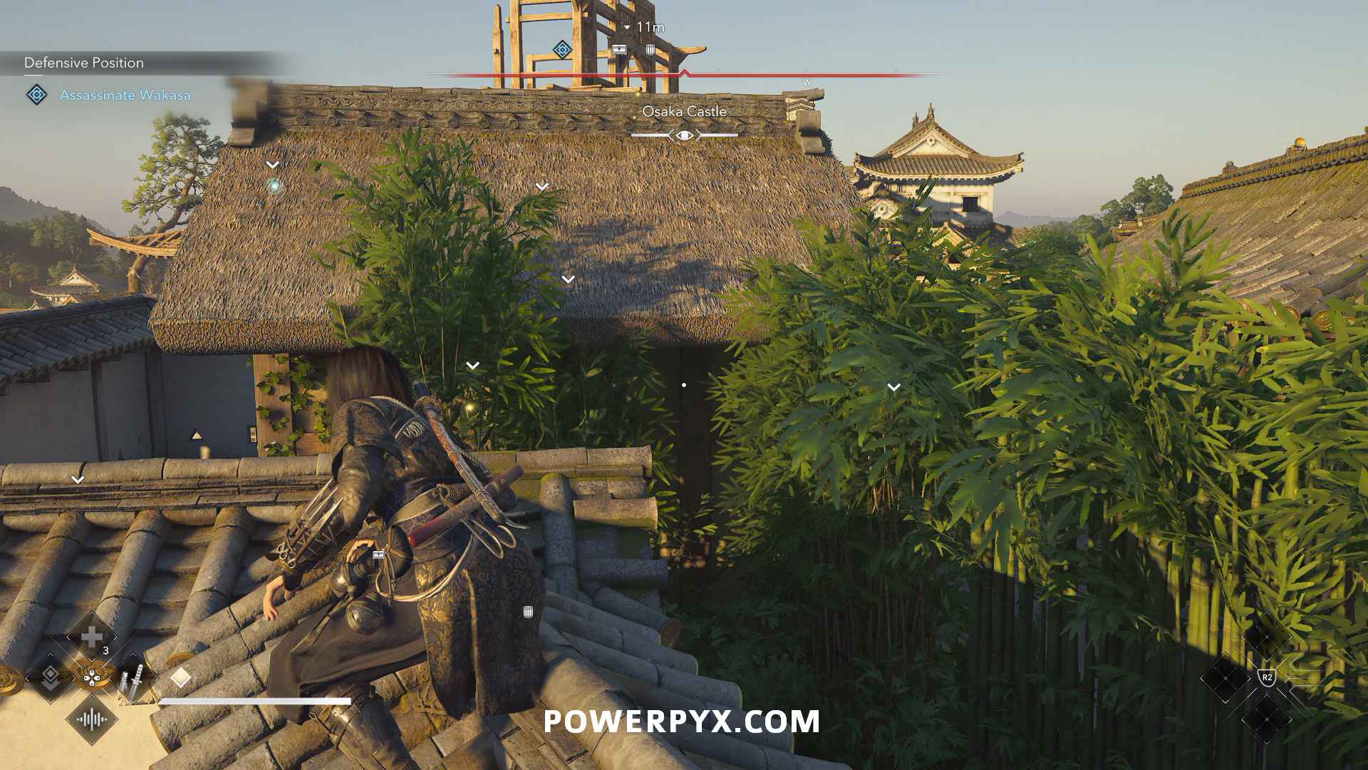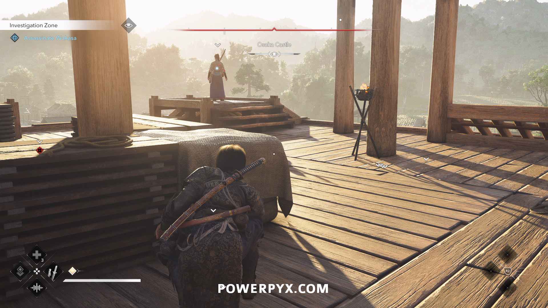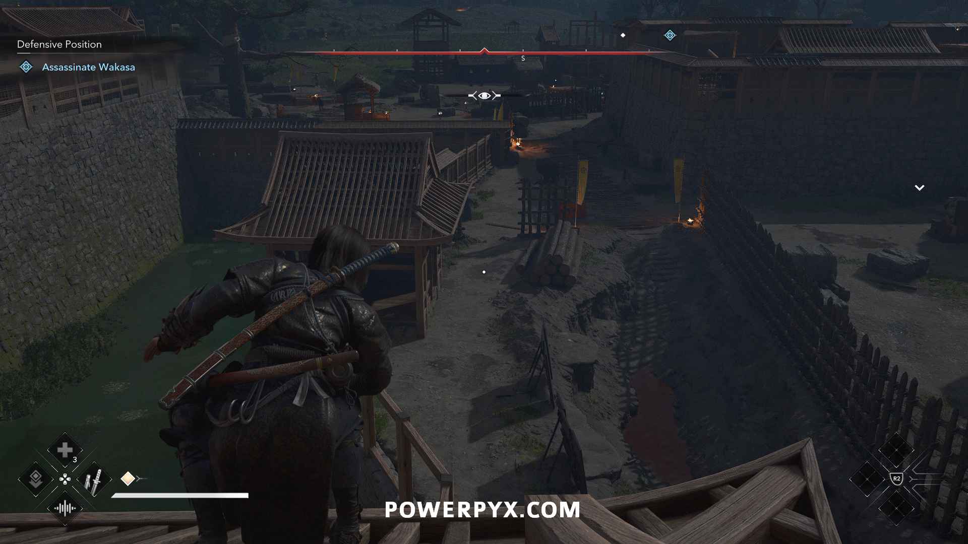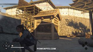 From there, you can see a path along the top of the wall to the construction site where Wakasa sits. Enemies patrol to the right, but you can stay on the left side of the wall roof to stay out of sight.