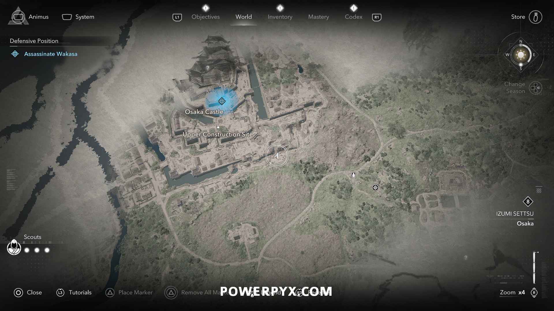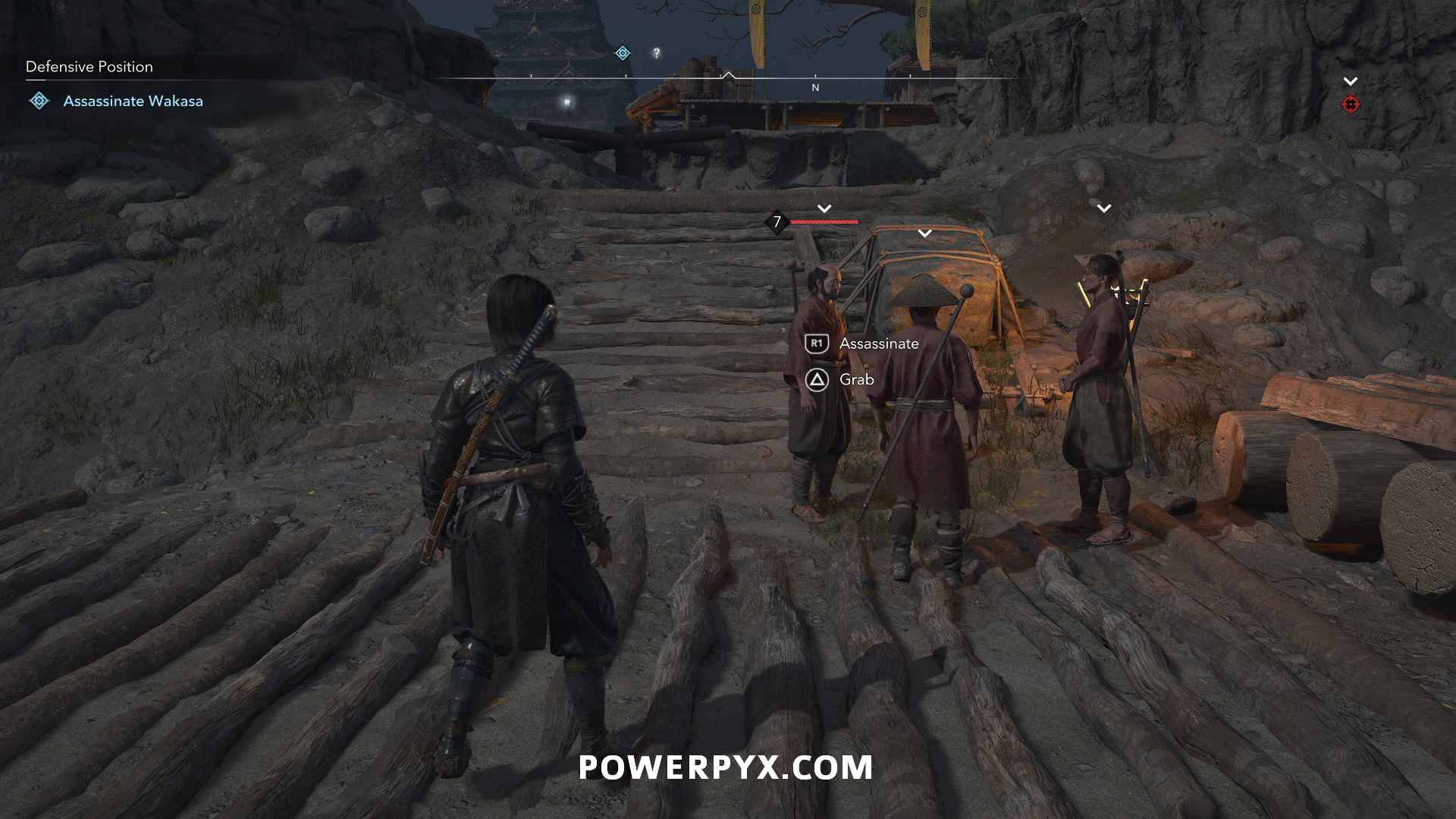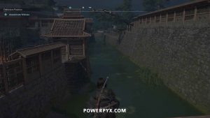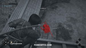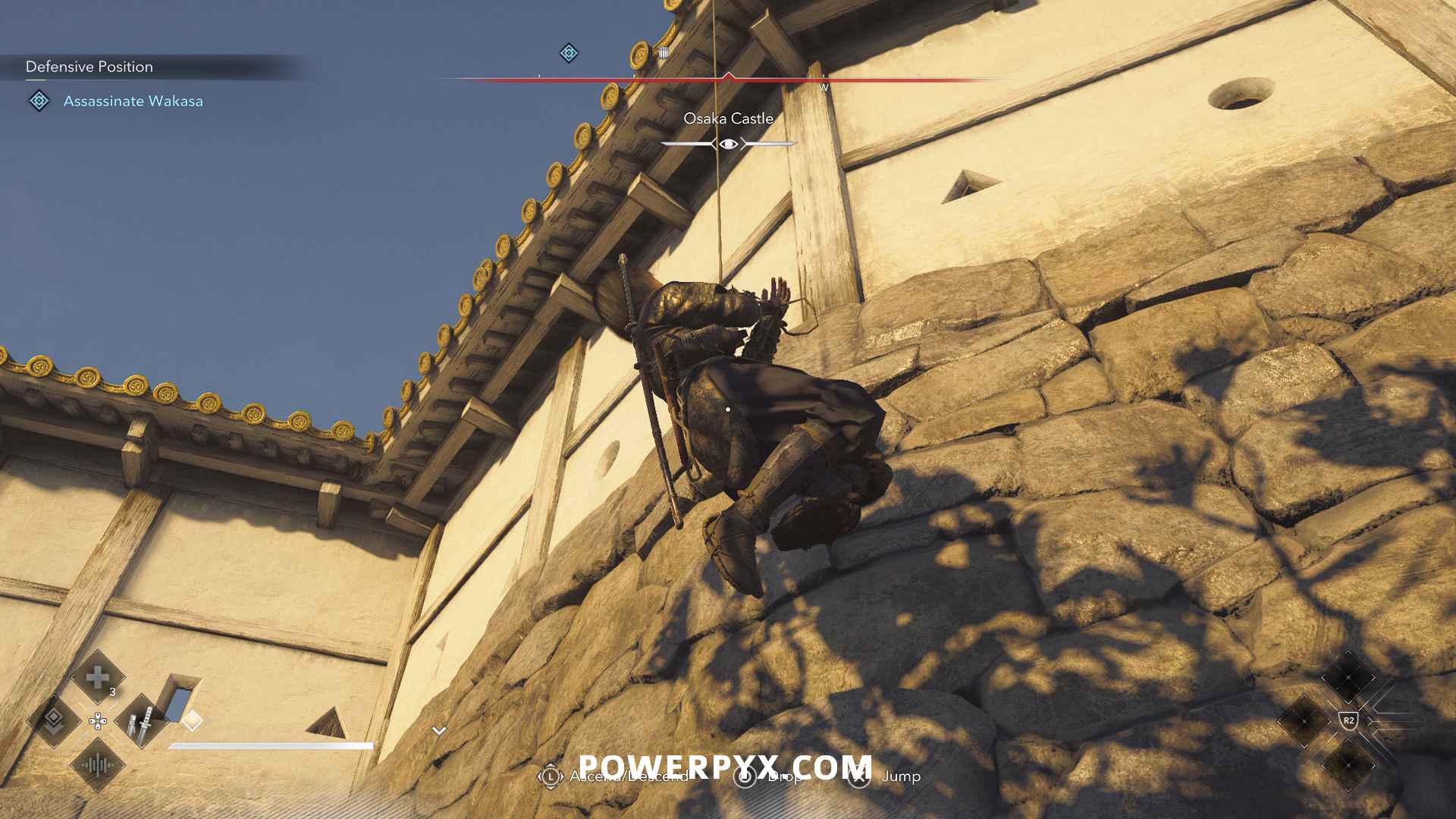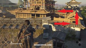 From there, you can see a path along the top of the wall to the construction site where Wakasa sits. Enemies patrol to the right, but you can stay on the left side of the wall roof to stay out of sight.