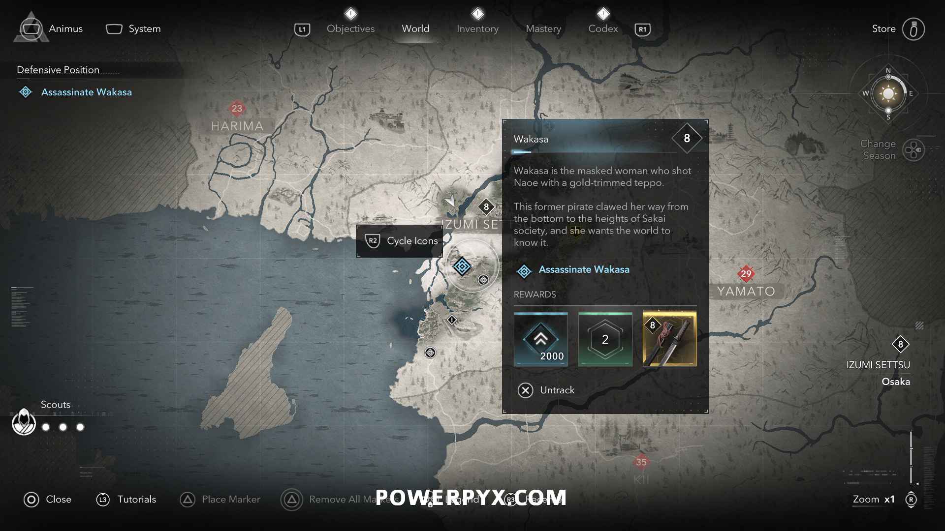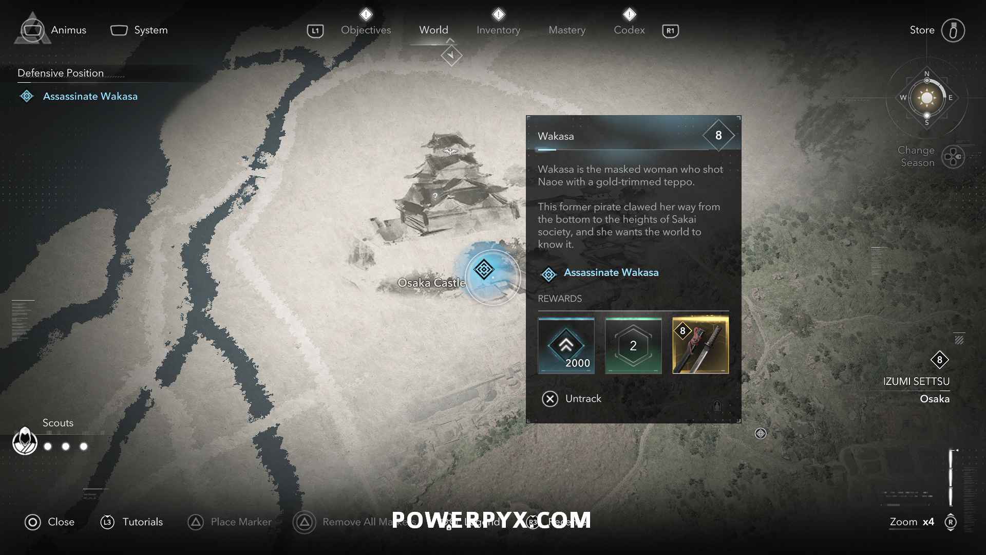 - Quest Description: Wakasa is the masked woman who shot Naoe with a gold-trimmed teppo. This former pirate clawed her way from the bottom to the heights of Sakai society, and she wants the world to know it.