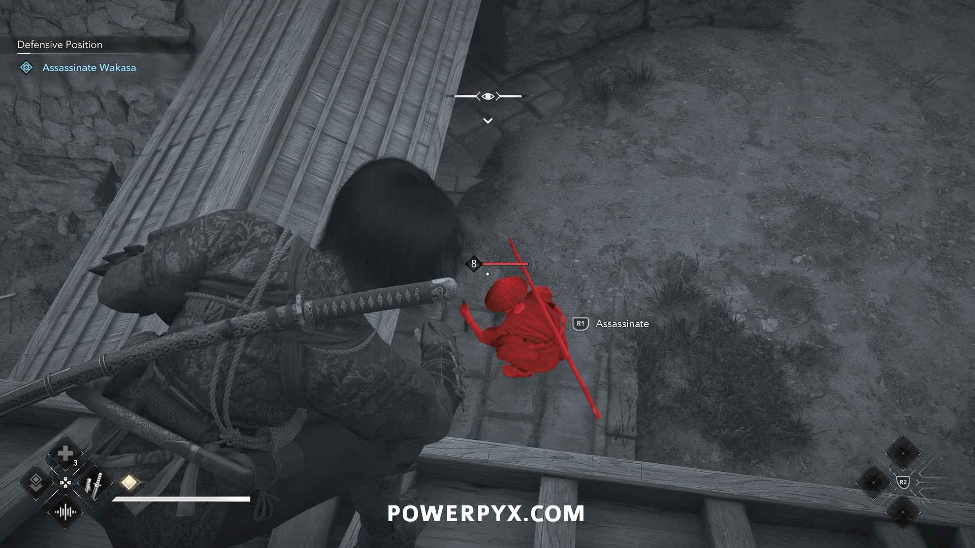 Take out the other enemy to make your life easier. Then, go and assassinate Wakasa when she’s looking away.
