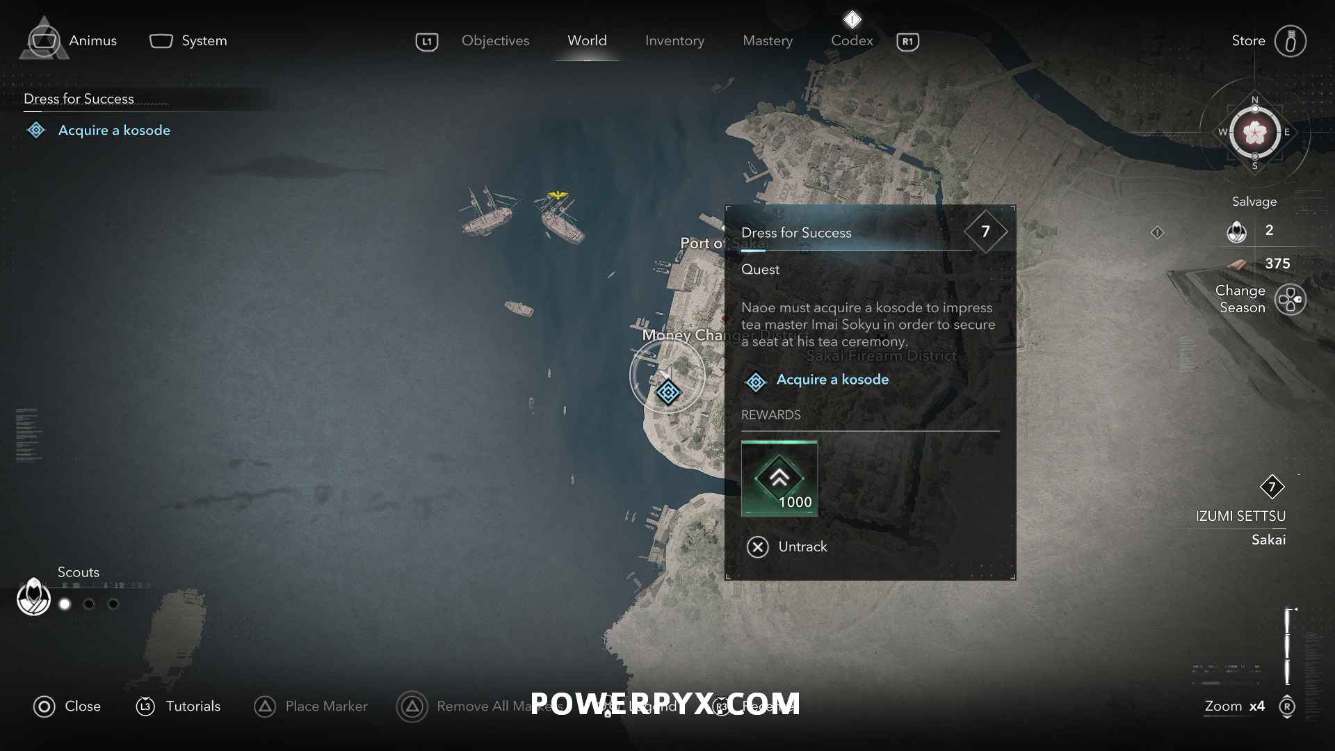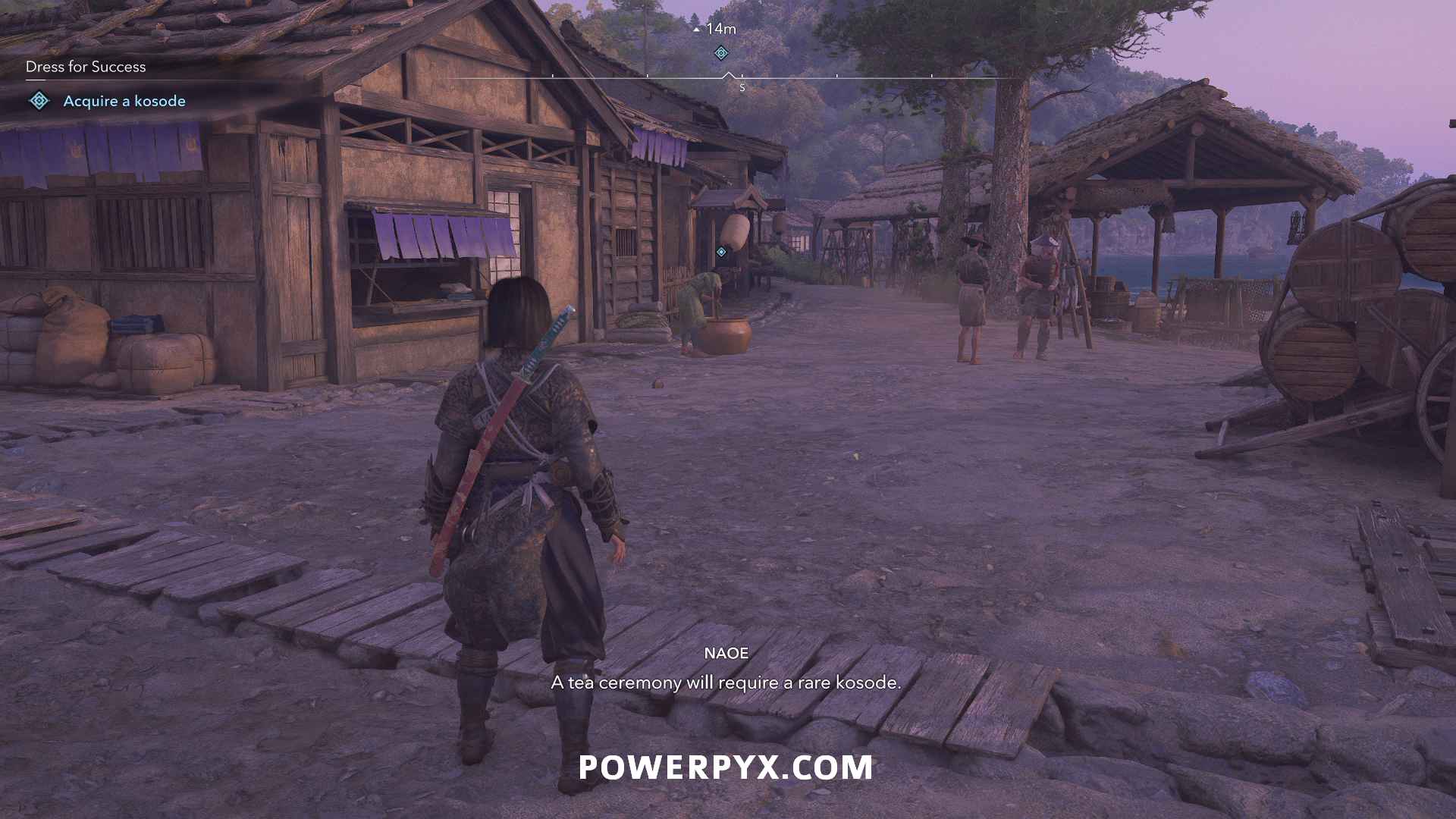 - Quest Description: Naoe must acquire a kosode to impress tea master Imai Sokyu in order to secure a seat at his tea ceremony.