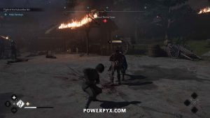 Follow this linear path until you cross another wooden bridge and reach Aekuni Shrine Town, which is burning. Partway through the town, Naoe’s horse gets shot.