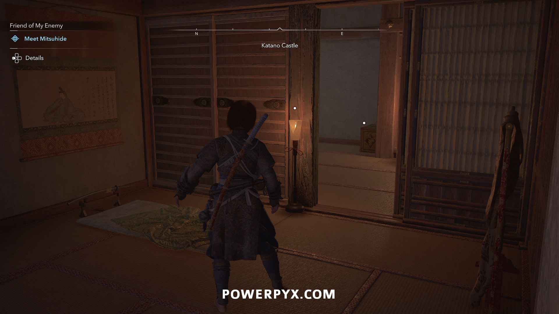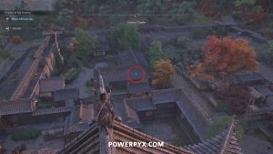 From the fast travel point at Katano Castle, observe to the north with