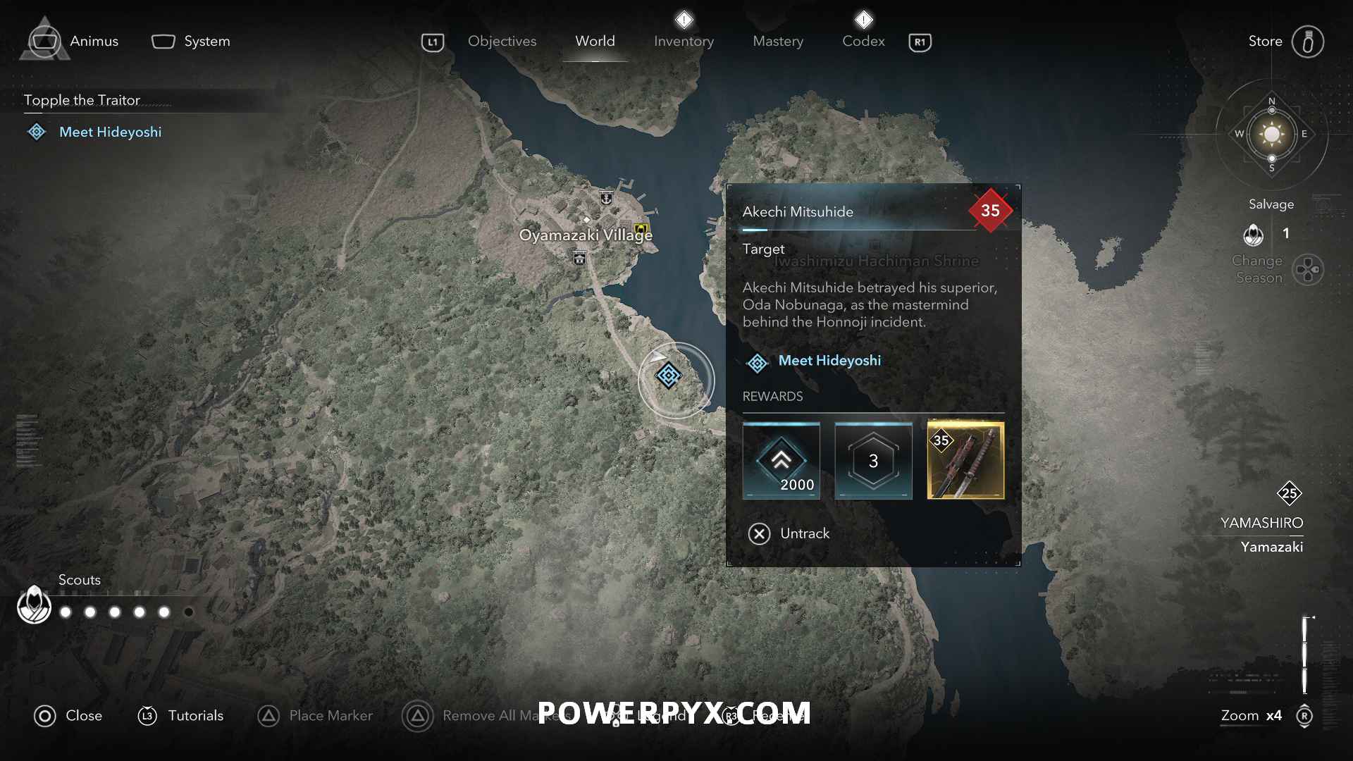 To track Topple the Traitor, navigate to the Objectives Board. Scroll to the Shinbakufu group and select the quest in the Akechi Mitsuhide thumbnail.