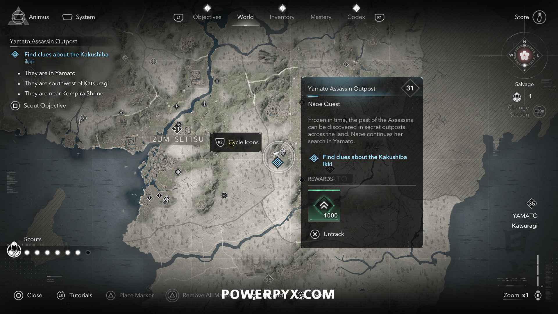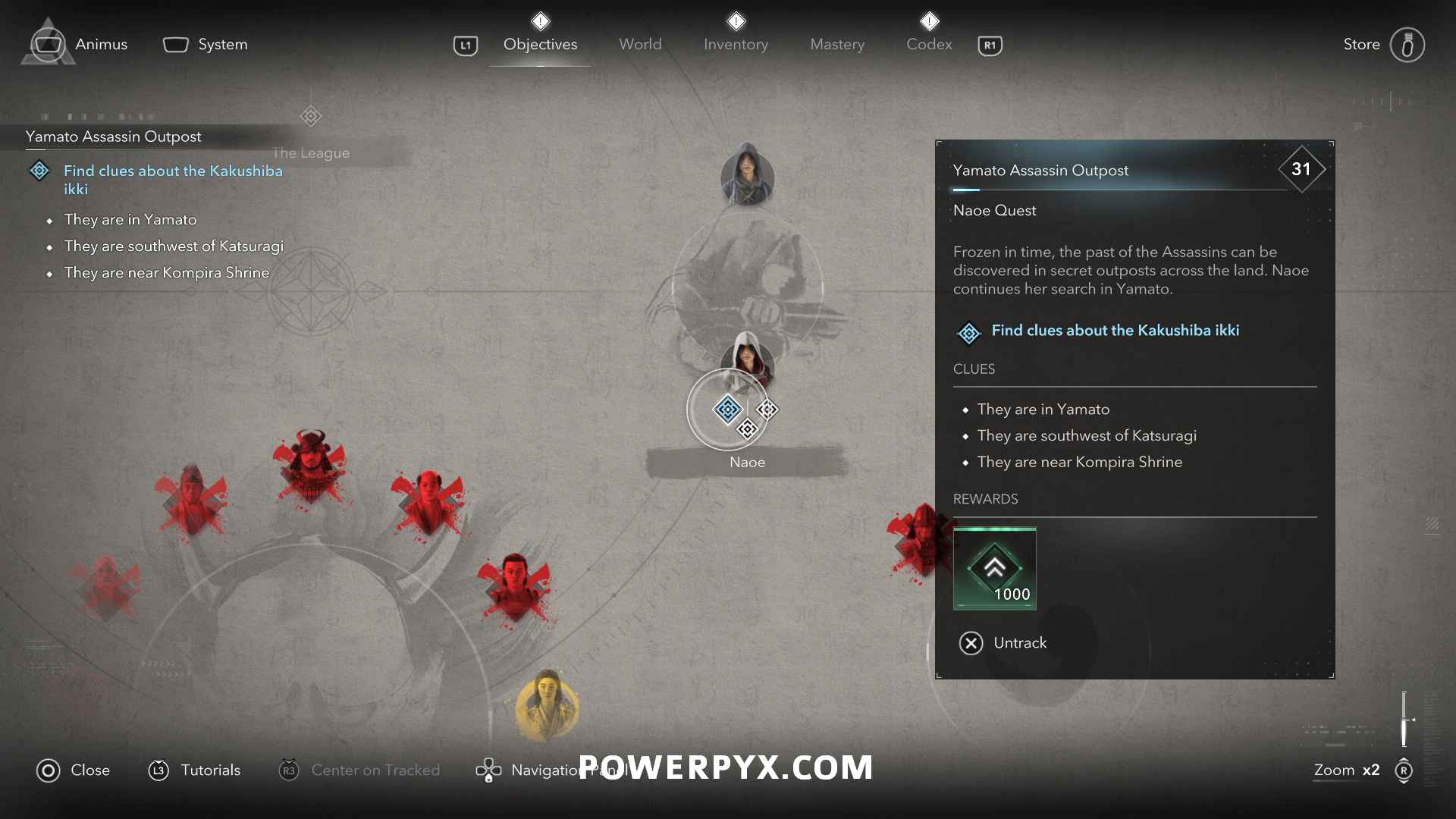 To track Yamato Assassin Outpost, navigate to the Objectives Board. Scroll to the Naoe group and select the quest under The Assassin (Naoe).